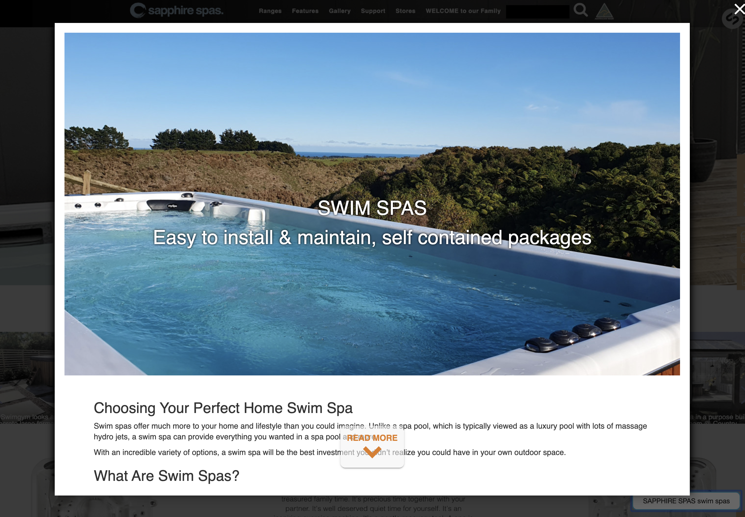 - the blue heading, black paragraph text & orange button are Paramount Pools' page content / the Sapphire WIDGET content begins with the Swim Spa install image