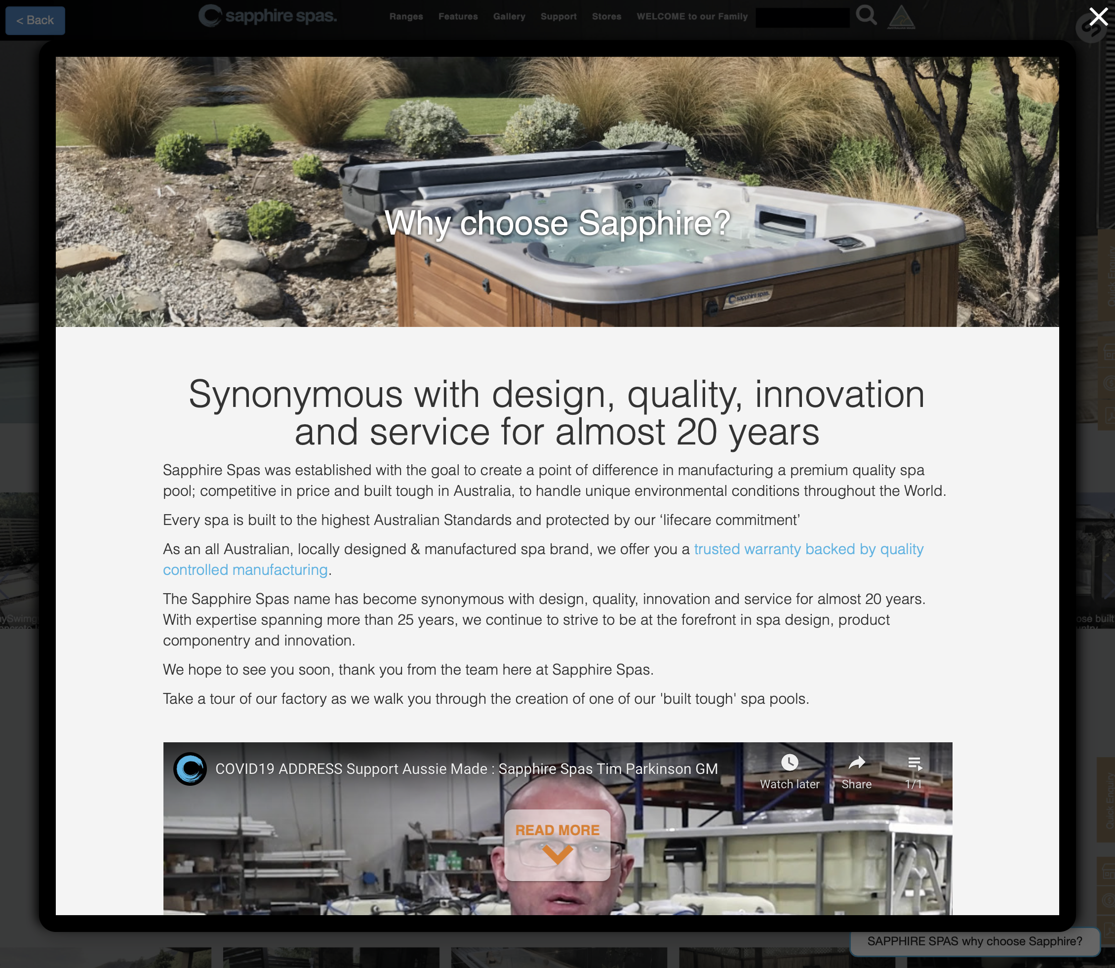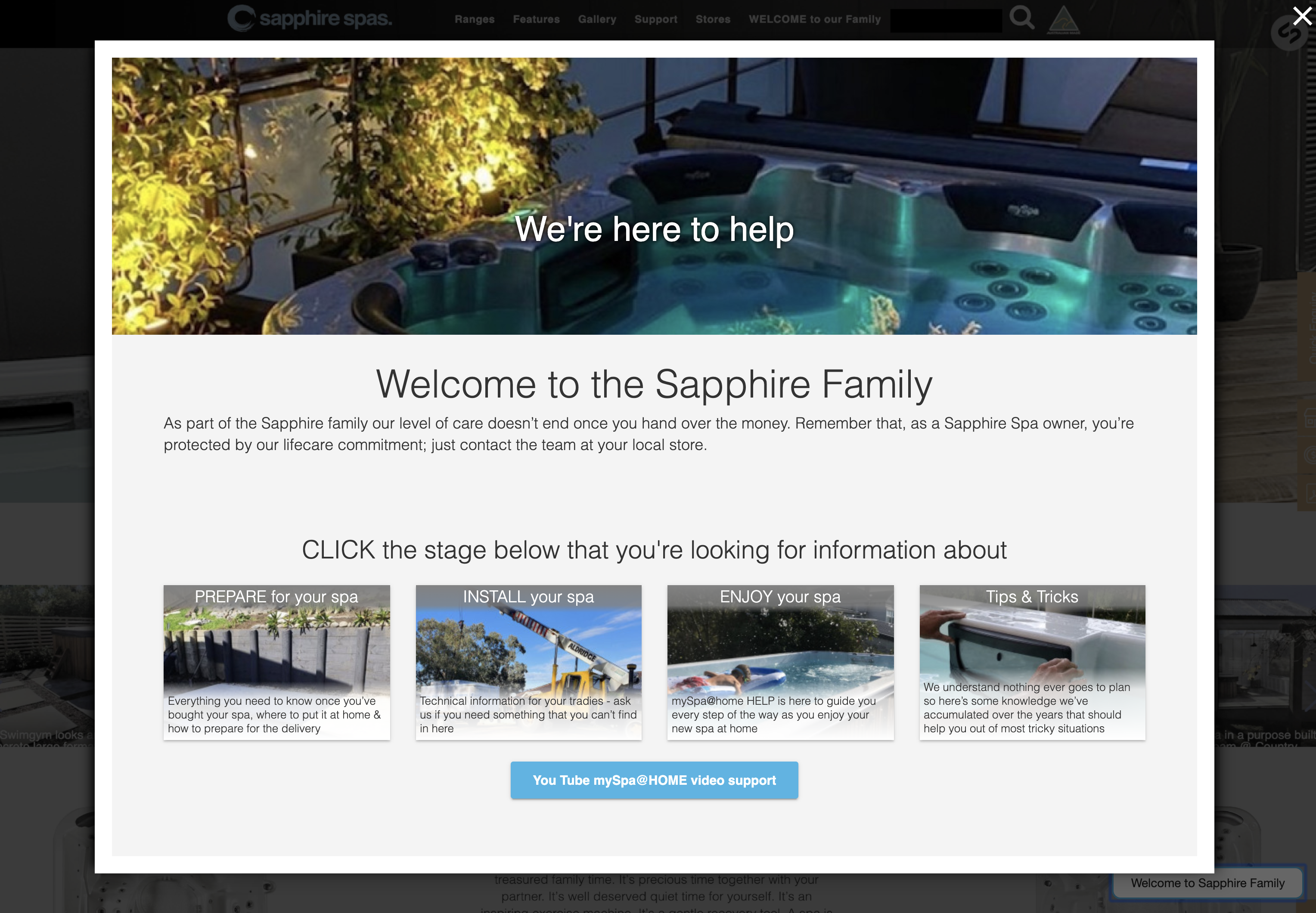 POPUP WINDOW option is also available if you need to display Sapphire info but remain on the current page (your site will fade into the background while your customer interacts with Sapphire Spas site but then return to your site exactly where they clicked the button, once they click the 'X' to close the window)