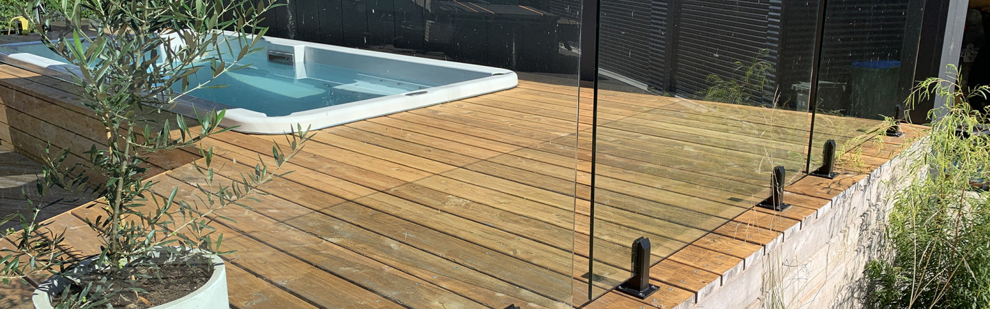 The glass panels which form the safety barrier could then be installed along the boundary of the decking to safely enclose the swim spa area. Matte black fittings were a good choice for this job.