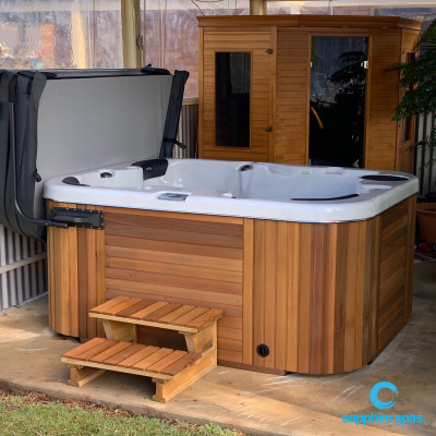 The perfect spot for this silverwhite spa with natural handcrafted western red cedar cabinet